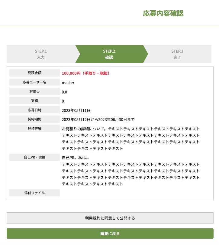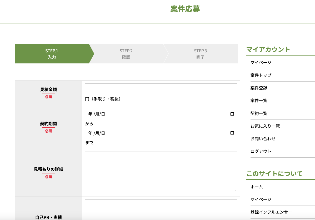 案件応募ページでは、提案金額、期間、自己PRなどを入力します。