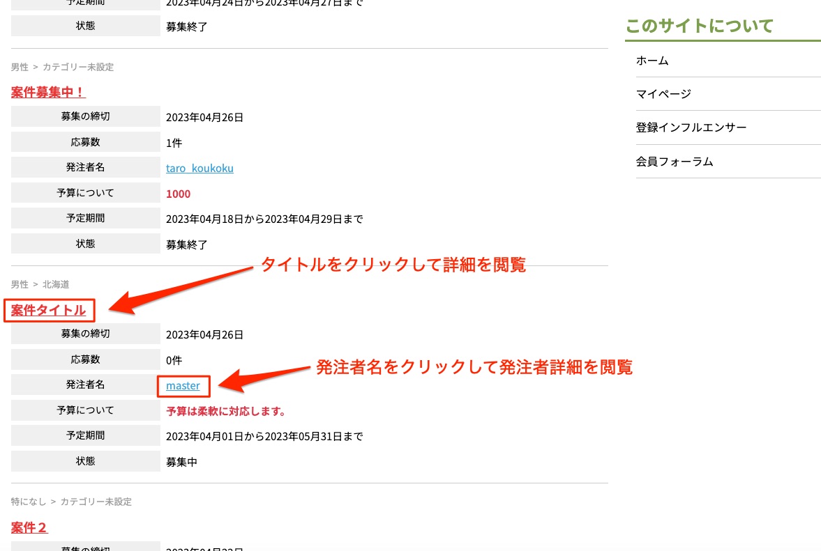 案件一覧表示から閲覧したい案件のタイトルをクリックすると、その案件の案件詳細ページが開きます。