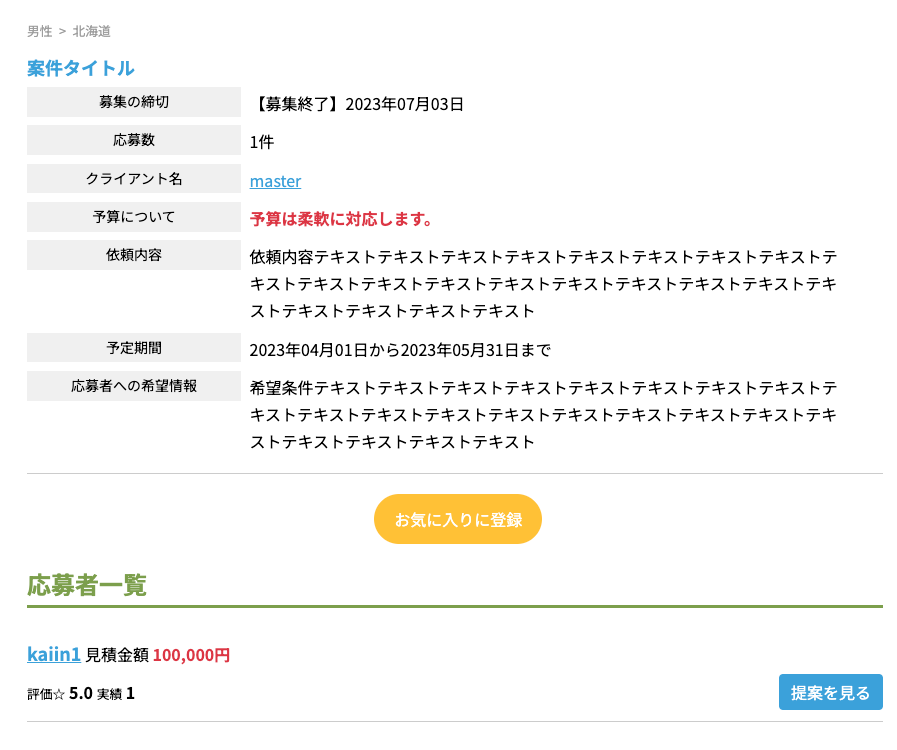 案件一覧のいずれかの案件をクリックすると以下のようなページが開き、案件の詳細や応募者を確認できます。